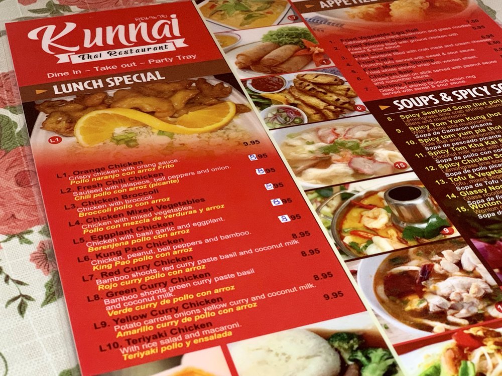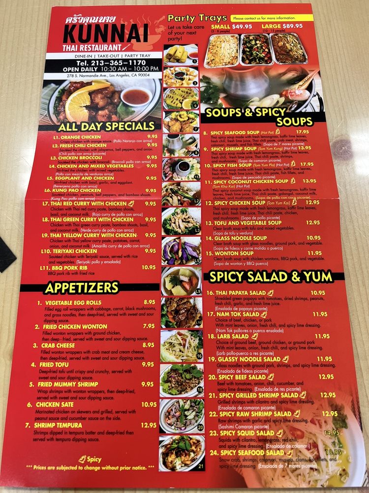 Kunai Thai Restaurant in Los Angeles offers a diverse menu with vegetarian options and a range of Thai delicacies. Located at 278 S Normandie Ave, this classy restaurant offers delivery, takeout, and catering services. With a focus on freshness and authentic flavors, their appetizers like Fried Vegetable Egg Rolls and Spicy Tom Yum Kung Soup are a must-try. Customers rave about the delicious and filling dishes, reasonable prices, and friendly staff. The Thai Papaya Salad, Pork Jerky, and Spicy Fried Rice are some of the favorites among diners. The cozy mom-and-pop vibe adds to the dining experience, making it a hidden gem for Thai food enthusiasts. Don't miss the opportunity to indulge in the vibrant flavors of traditional Thai cuisine at Kunnai Thai Restaurant.
